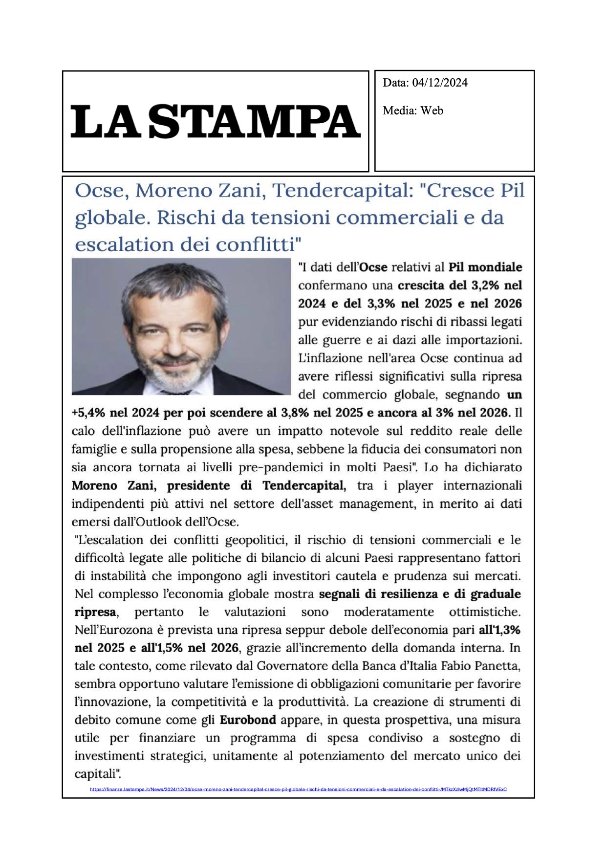 Ocse, Moreno Zani, Tendercapital: "Cresce Pil globale. Rischi da tensioni commerciali e da escalation dei conflitti"